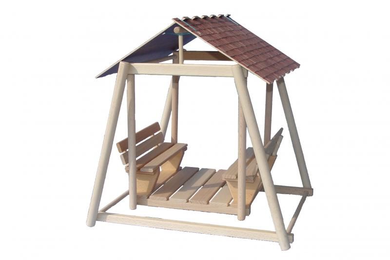 Dřevěná houpačka má pohyblivé lavičky na kterých se dají houpat třeba panenky.