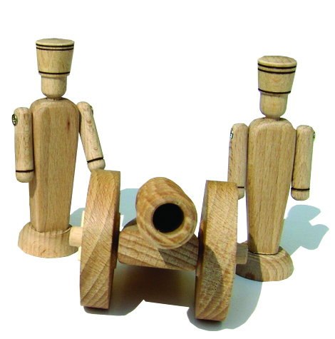Dřevěné dělo má pohyblivé kolečka a vojáčci ručičky.