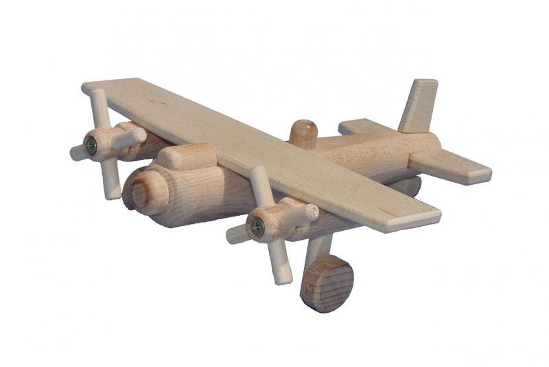 Dřevěné letadélko má pohyblivé kolečka a točícíse vrtuli.
