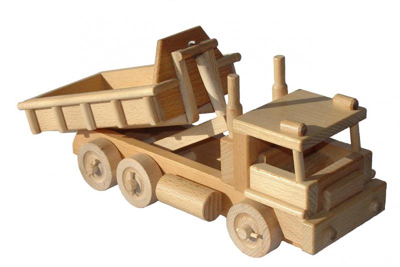 Dřevěné auto má pohyblivé kolečka a sklápěcí kontejnér který se dá odpojit.
