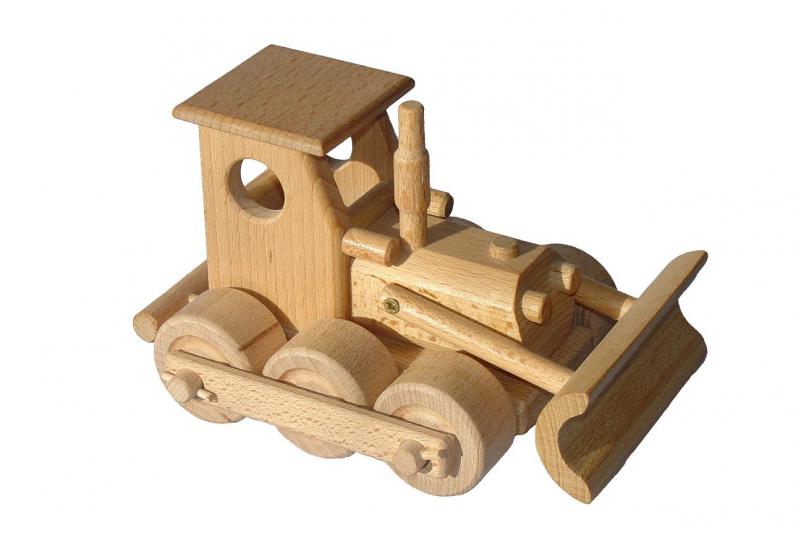 Dřevěný buldozér má pohyblivé kolečka a radlici.