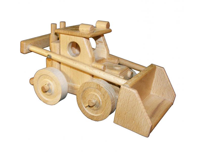 Dřevěný nakladač má pohyblivé kolečka a lžíci.