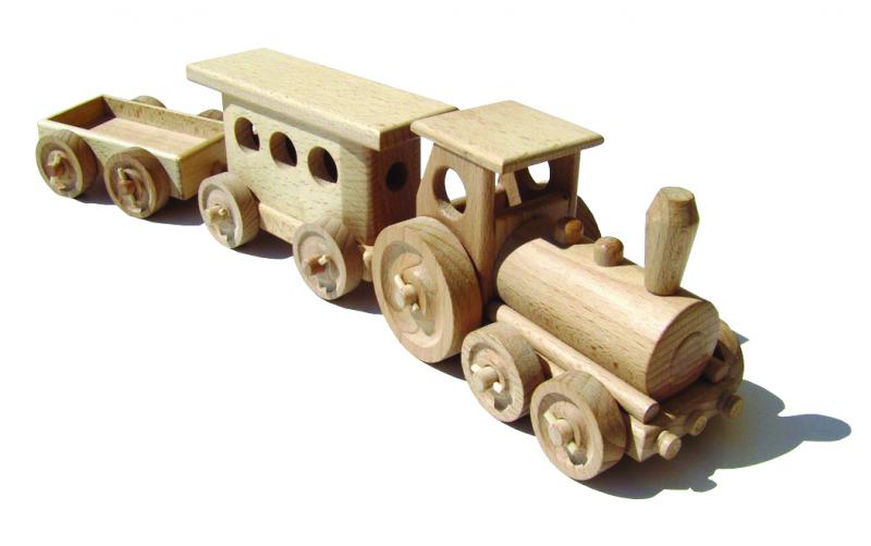 Dřevěný vlak má pohyblivé kolečka a vyměnitelné vagóny.