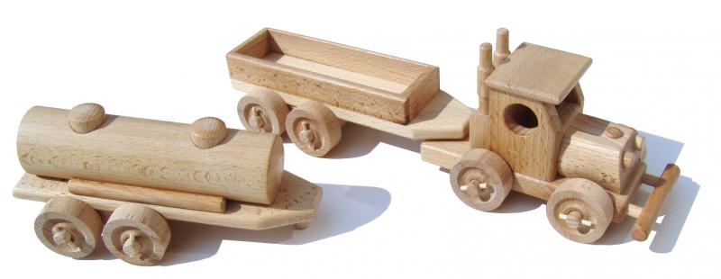 Dřevěný tahač má pohyblivé kolečka a dva kusy přívěsu které se dají snadno vyměnit.