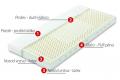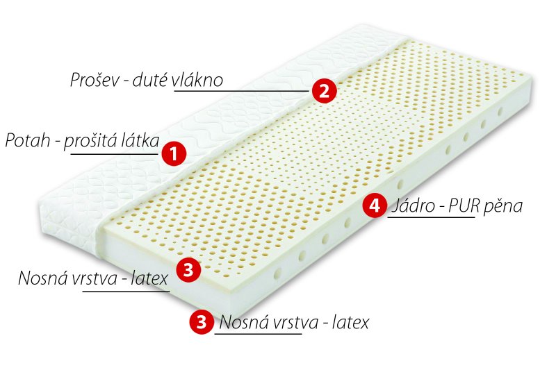 Vysoce kvalitní sendvičová matrace, jejíž jádro je tvořeno latexovými deskami vyztuženými PUR-pěnou s vysokou elasticitou. V jádru matrace jsou příčné perforace, které poskytují změkčení v oblasti ramen a zajišťují provzdušnění matrace a odvod absorbovaných vodních par. Nosnou vrstvu matrace tvoří latex, který zaručuje pohodlí, uvolnění svalstva a dlouhou životnost matrace. Díky vhodné kombinaci materiálů matrace poskytuje optimální oporu páteře a vynikající ortopedické vlastnosti. Potah matrace je velice příjemný na dotek, je snímatelný, pratelný na 60°C, je konstruován ze dvou samostatných polovin pro snazší praní v běžných pračkách.