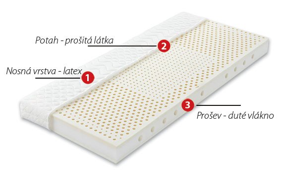 Vysoce kvalitní sendvičová matrace, jejíž jádro je tvořeno latexovými deskami vyztuženými PUR-pěnou s vysokou elasticitou. V jádru matrace jsou příčné perforace, které poskytují změkčení v oblasti ramen a zajišťují provzdušnění matrace a odvod absorbovaných vodních par. Nosnou vrstvu matrace tvoří latex, který zaručuje pohodlí, uvolnění svalstva a dlouhou životnost matrace. Díky vhodné kombinaci materiálů matrace poskytuje optimální oporu páteře a vynikající ortopedické vlastnosti. Potah matrace je velice příjemný na dotek, je snímatelný, pratelný na 60°C, je konstruován ze dvou samostatných polovin pro snazší praní v běžných pračkách.