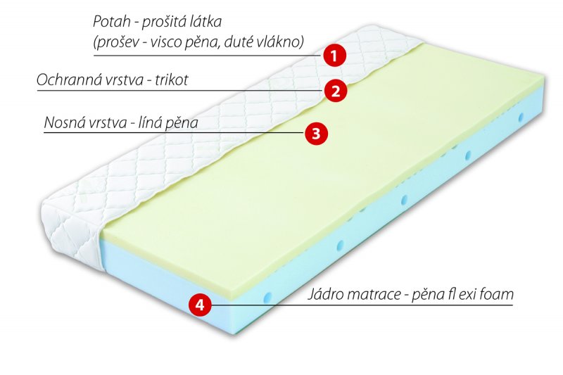 Komfortní matrace, která díky vhodné kombinaci materiálů poskytuje jedinečné ortopedické vlastnosti. Jádro matrace tvoří PUR pěna flexi foam. Na spodní straně jádra jsou odvzdušňovací kanálky určené k větší ventilaci vzduchu. Nosnou vrstvu matrace tvoří líná pěna, která při kontaktu s lidským tělem optimalizuje svoji tuhost podle absorbovaného tepla, což zaručuje výborné přizpůsobení matrace jakékoliv váhové kategorii při všech režimech spánku (na zádech, na boku, ... ). Pro dosažení lepších ortopedických vlastností a vyššího komfortu spánku je viscoelastická pěna zakomponována i do proševu matrace. Potah je hypoalergenní, snímatelný.
