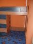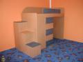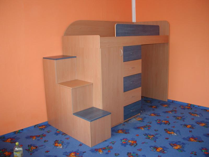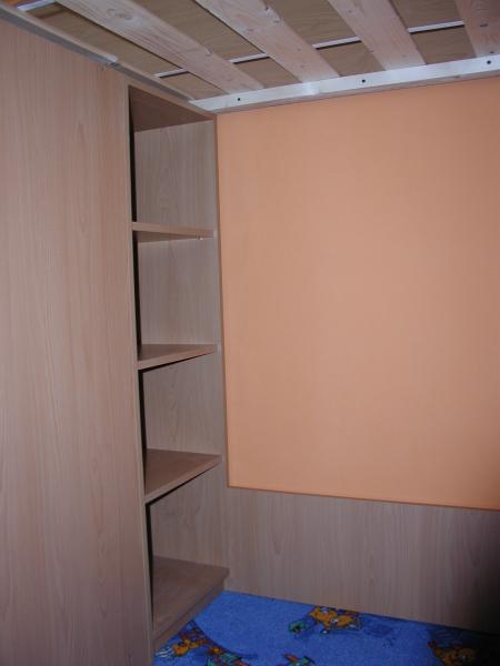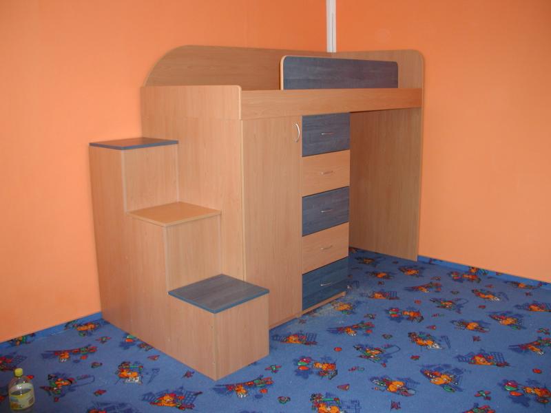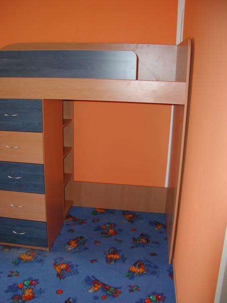 Dvířka jsou olemovány 2 ABS s oblými hranami. Tato sestava je tvořená horní postelí která je uložena na skříní se šuplíky, šatní skříní a knihovnou která je z vnitřní strany postele viz foto v galerii níže.K této posteli je možno přidat psací stůl do spodní části nebo další postel. Postel je vhodná do každého