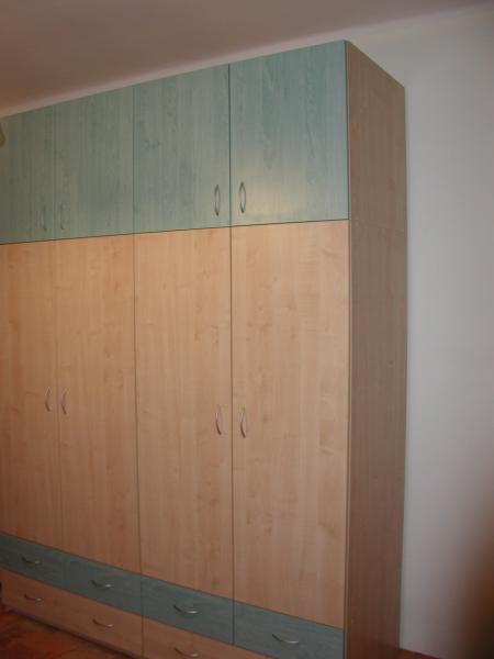 šatní skříň se šuplíky, policemi, šatní tyč, s nadstavcem které pohodlně vystačí na všechno oblečení dětí. Všechny věci mají své místo a jsou přehledně uloženy. Dále sestava obsahuje