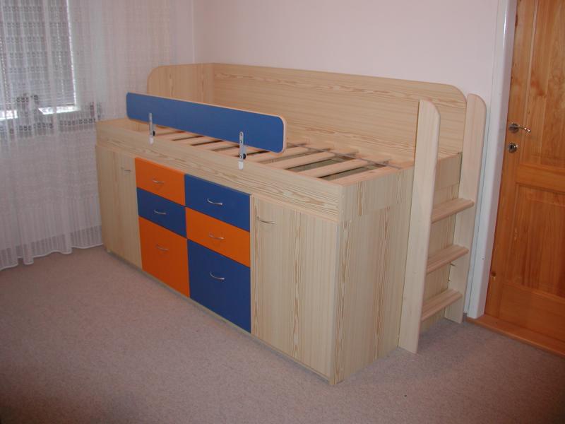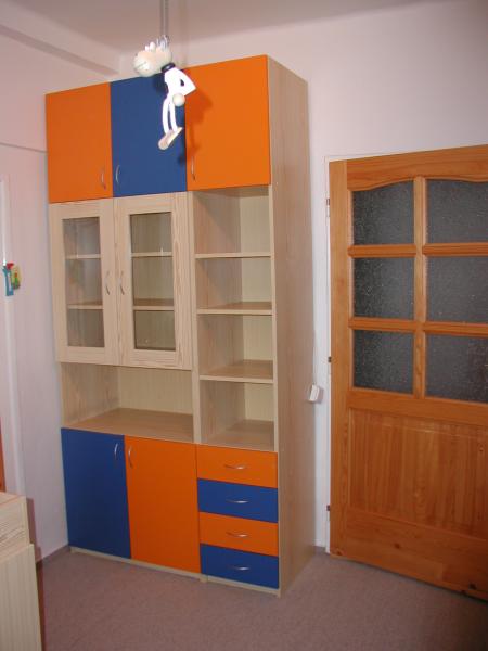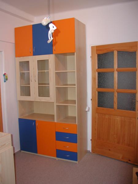 Dětský barevný pokoj , je vyroben ze smrkového lamina v kombinaci s oranžovou a tmavě modrou barvou dvířek. Dvířka jsou olemovány 2 ABS s oblými hranami. Tato sestava byla vytvořená na základě požadavku zákazníka, který chtěl vhodně vybavit