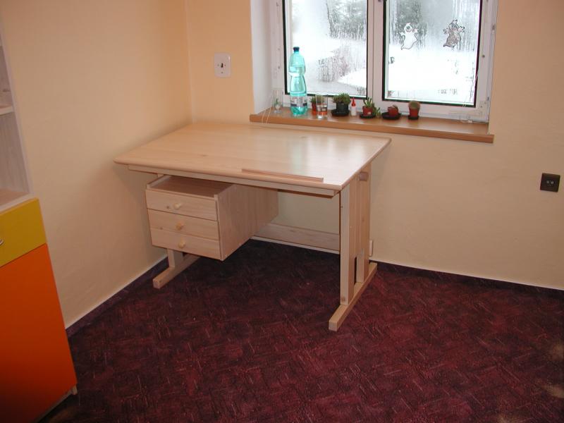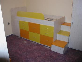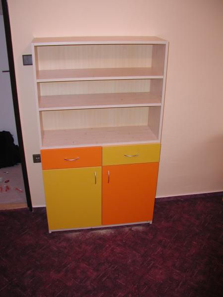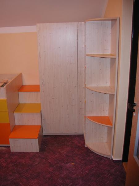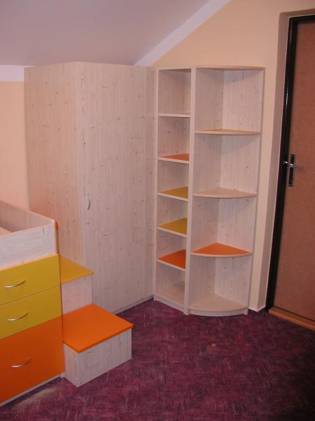 Studentský podkrovní pokoj , je vyroben z smrkového lamina v kombinaci s žlutýmí a oranžovýmí dvířky. Dvířka jsou olemovány 2 ABS s oblými hranami. Tato sestava byla vytvořená na základě požadavku zákazníka, který chtěl vhodně vybavit